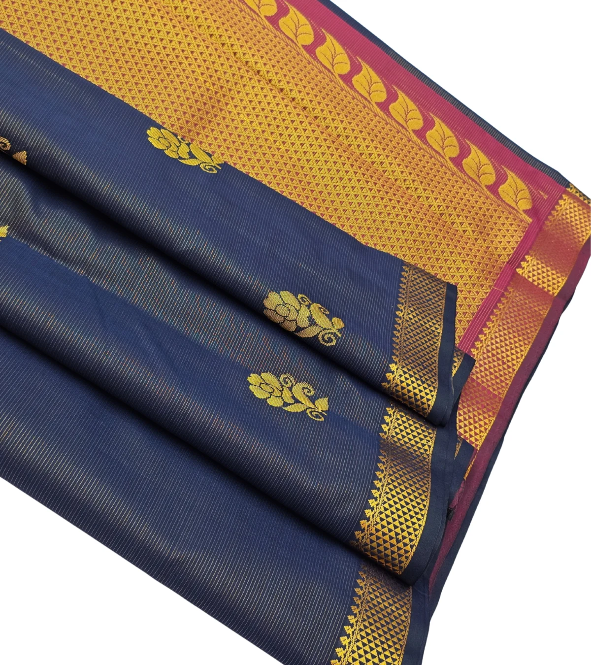 “Majestic navy blue adorned with golden floral buttas and a grand zari pallu – this semi soft silk saree speaks pure royalty. 👑 Perfect to dazzle at weddings and festive nights! ✨”
