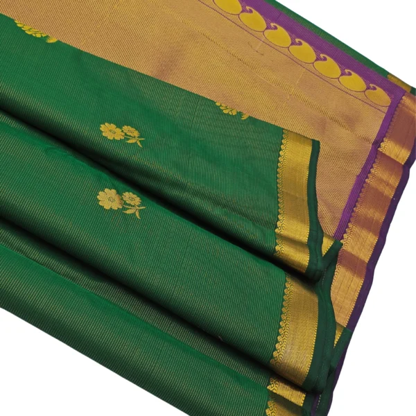 “Grace in every drape – this olive green semi soft silk saree with a grand magenta-gold pallu is pure elegance woven. ✨ Perfect for making every occasion a royal affair! 👑”