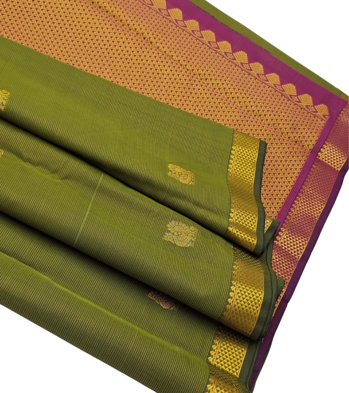 “Grace in every drape – this olive green semi soft silk saree with a grand magenta-gold pallu is pure elegance woven. ✨ Perfect for making every occasion a royal affair! 👑”