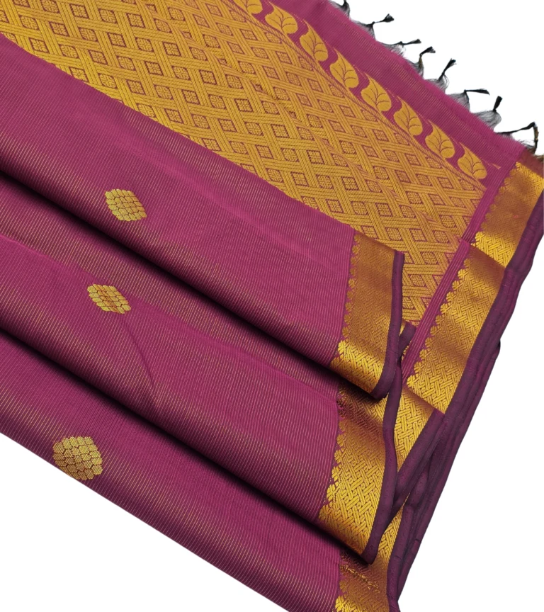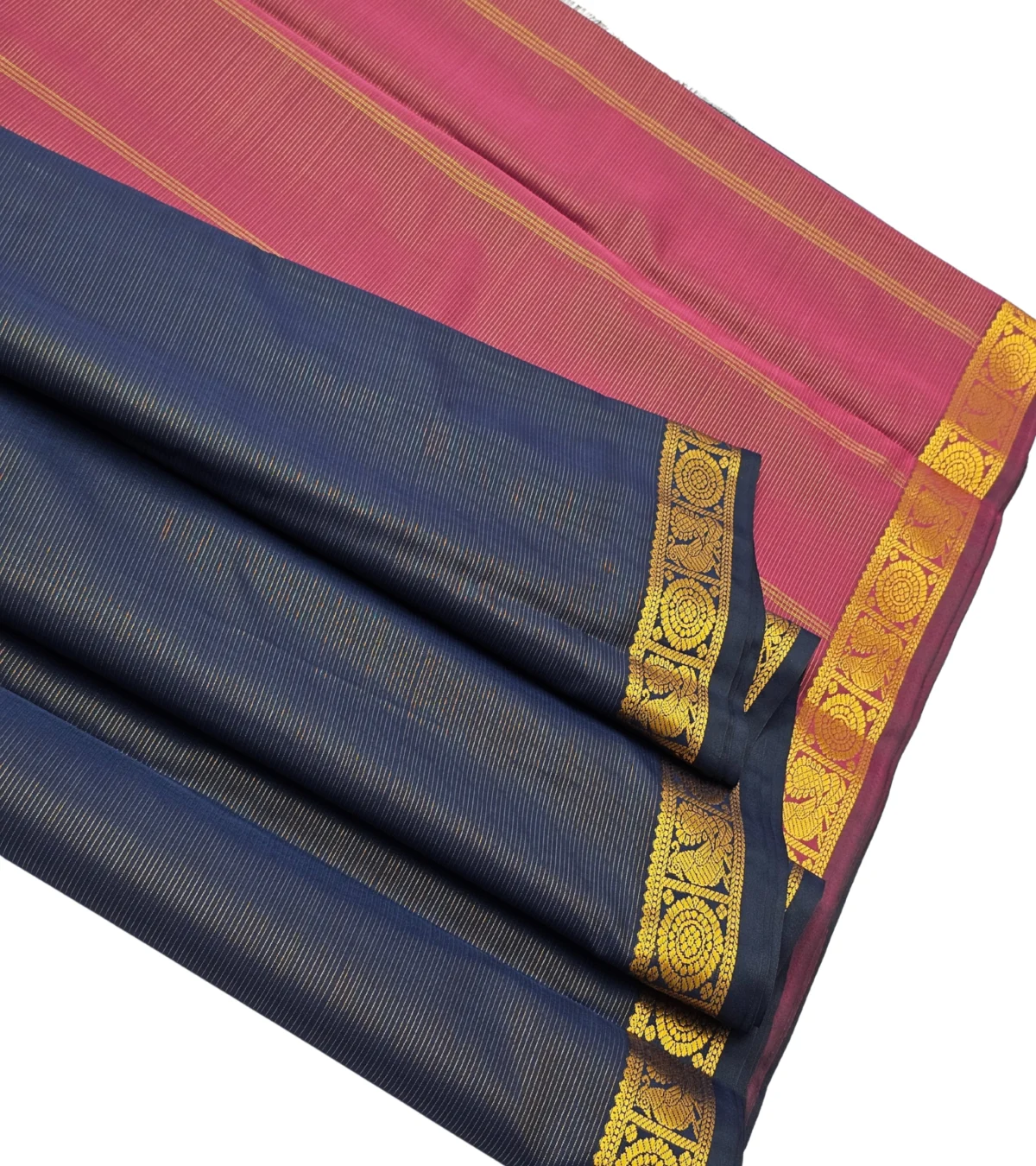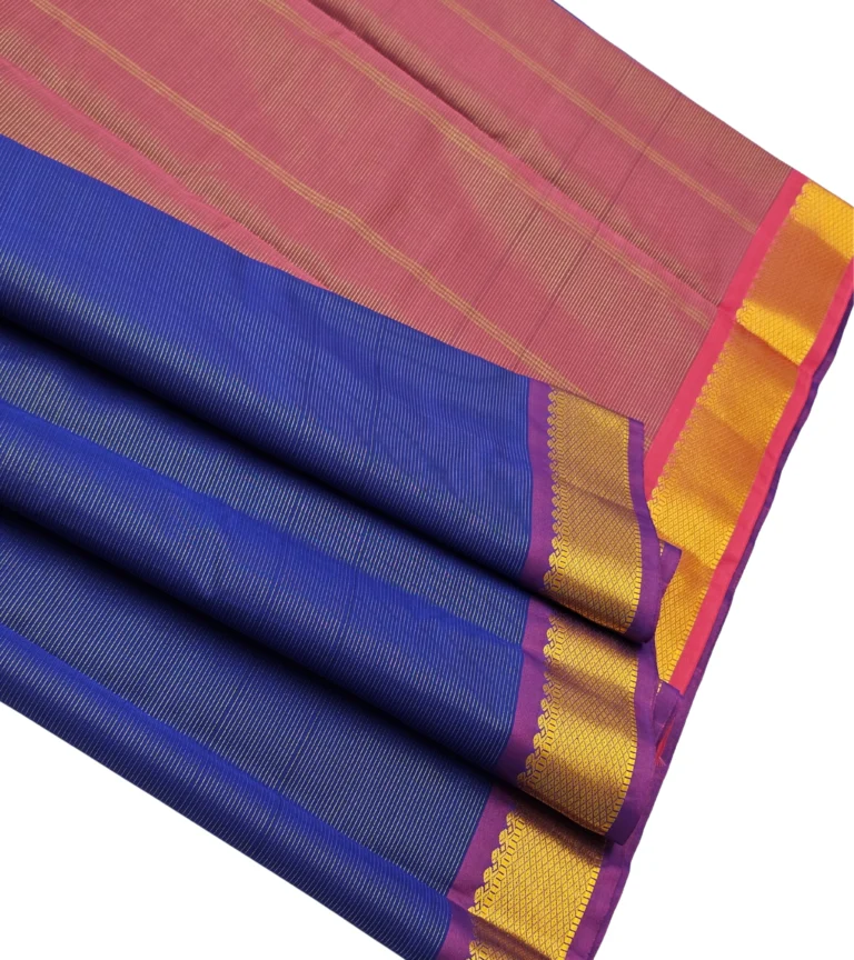 “Royal navy meets rich magenta – this semi soft silk saree with intricate golden zari border is a timeless showstopper. 💫 Perfect to turn every head at any celebration! 🎉”