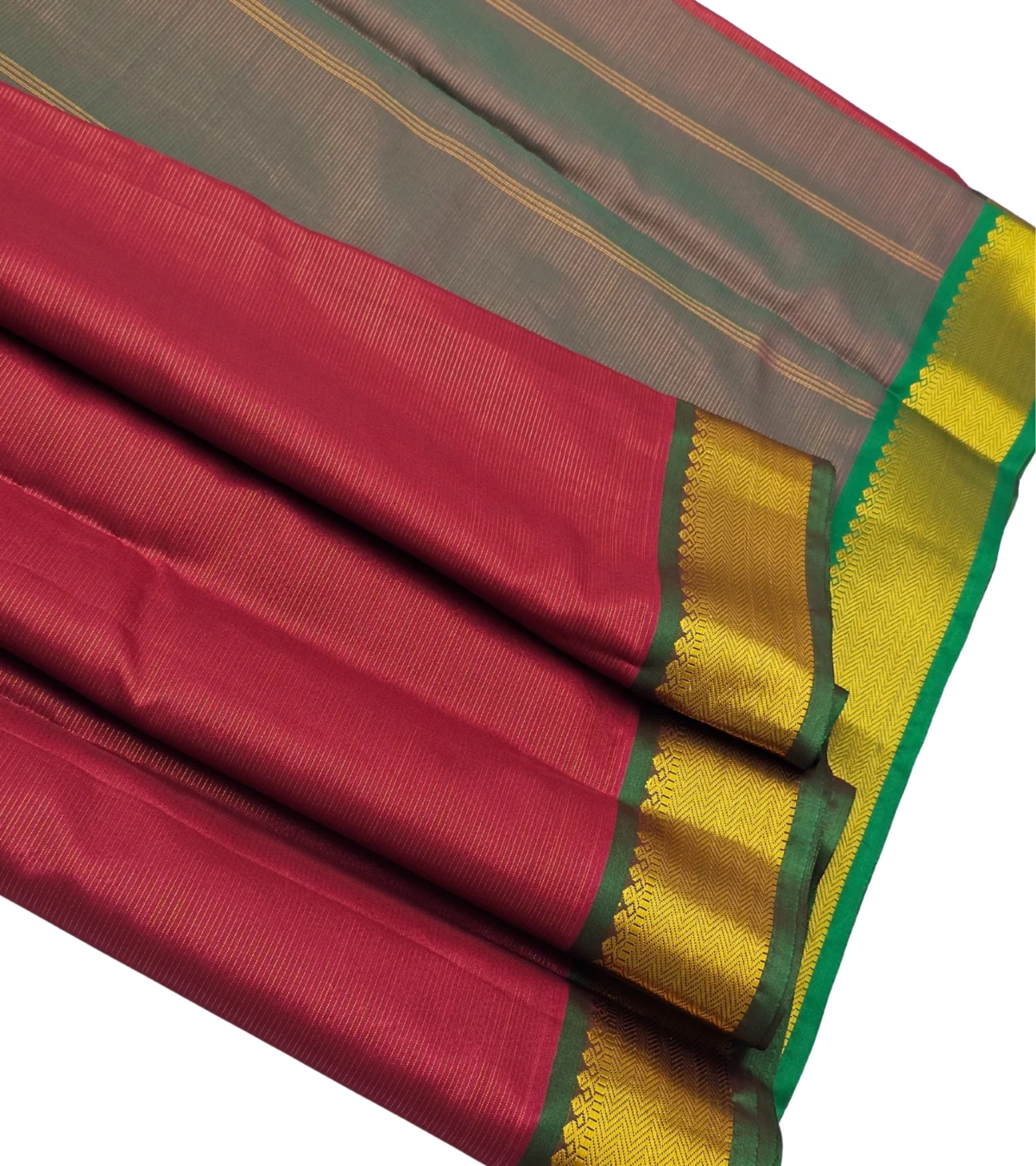 “Rich maroon paired with an enchanting grey pallu and gleaming golden-green border – this semi soft silk saree is grace redefined. 🌟 A flawless choice for weddings and grand celebrations! 💫”