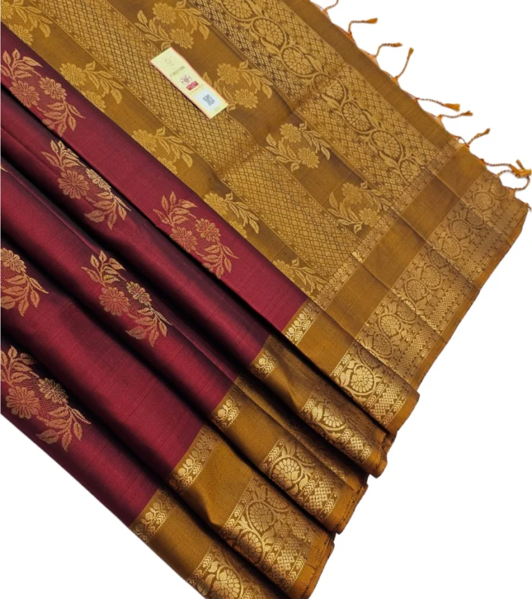 This saree is a radiant fusion of baby pink and deep bottle green , adorned with shimmering gold motifs. The richly woven maroon pallu bursts with intricate floral and geometric zari designs, while the body features graceful bird-inspired patterns in gold. A bold expression of cultural grandeur, this saree is perfect for those who cherish timeless elegance with a vibrant twist.