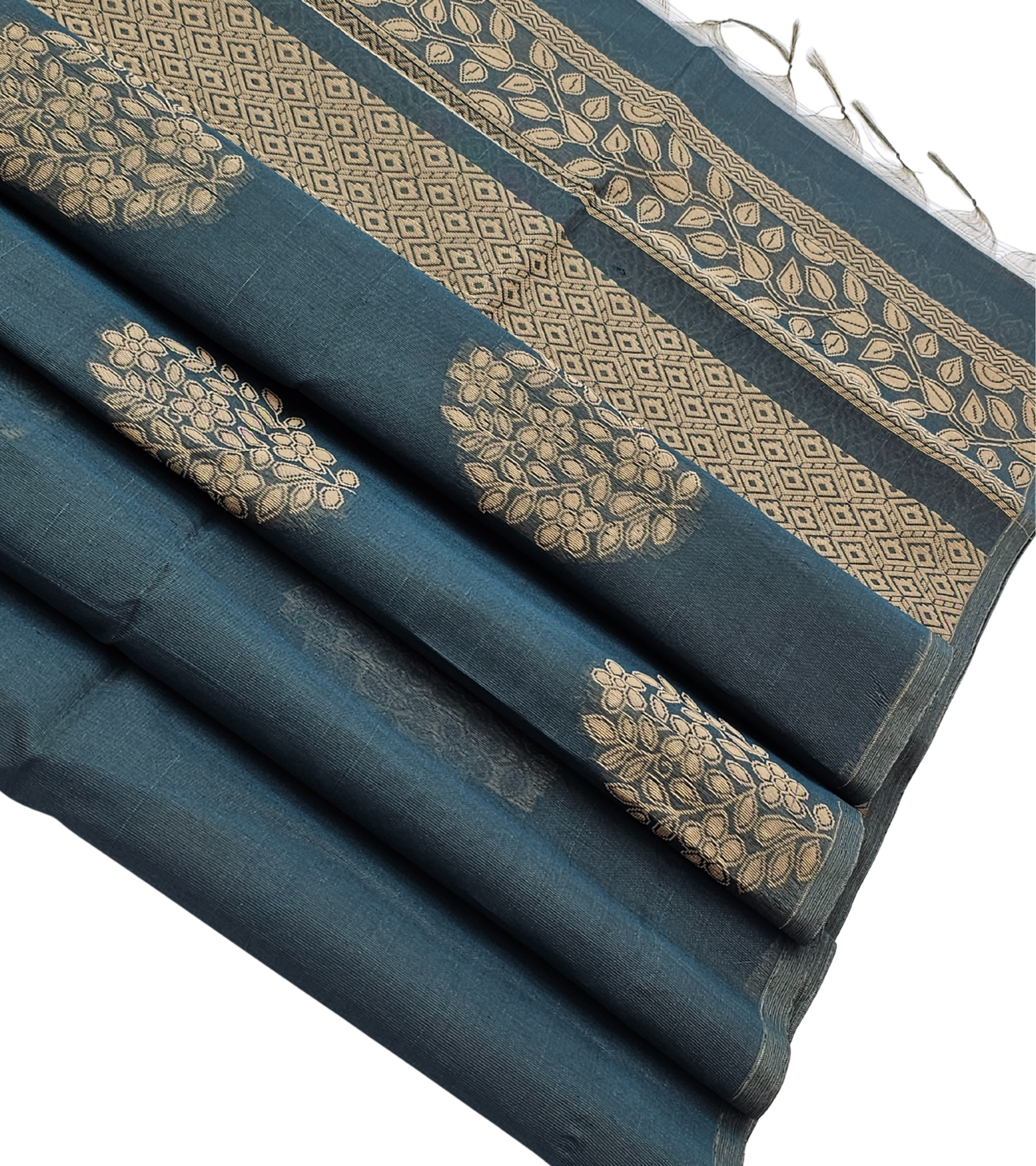 Elephant gray, this handloom silk saree shines with elegant golden motifs that whisper tradition and grace. 🌿✨ Perfect for festive occasions, it blends timeless beauty with rich cultural charm.