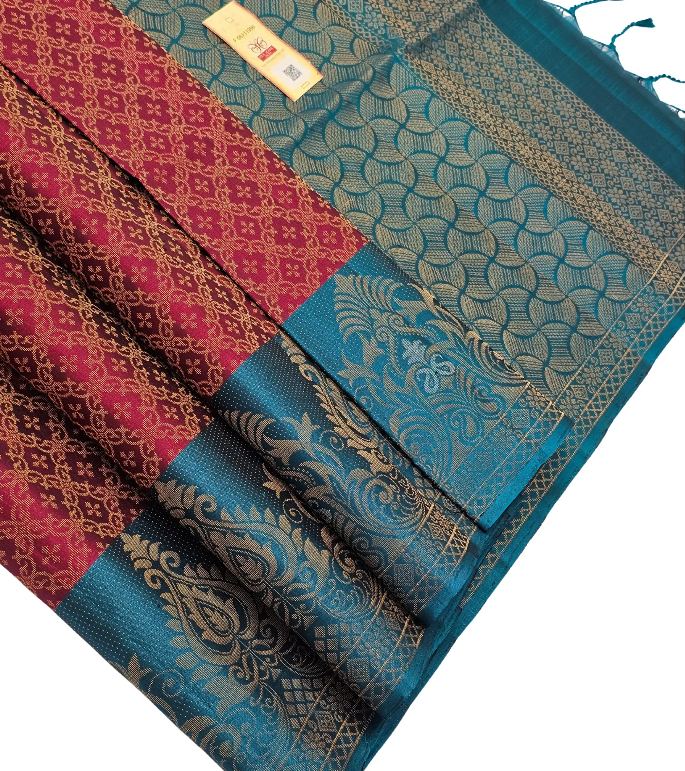 A rich maroon body beautifully contrasts with a cool teal pallu, woven in graceful traditional motifs.