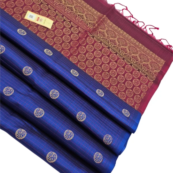 This stunning saree showcases a regal fusion of deep purple and royal maroon, adorned with gold zari circular motifs that exude opulence. The pallu is richly woven with intricate floral and spiral patterns, adding depth and heritage charm. Perfect for weddings and grand celebrations, this saree is a vibrant statement of tradition with a touch of contemporary flair.