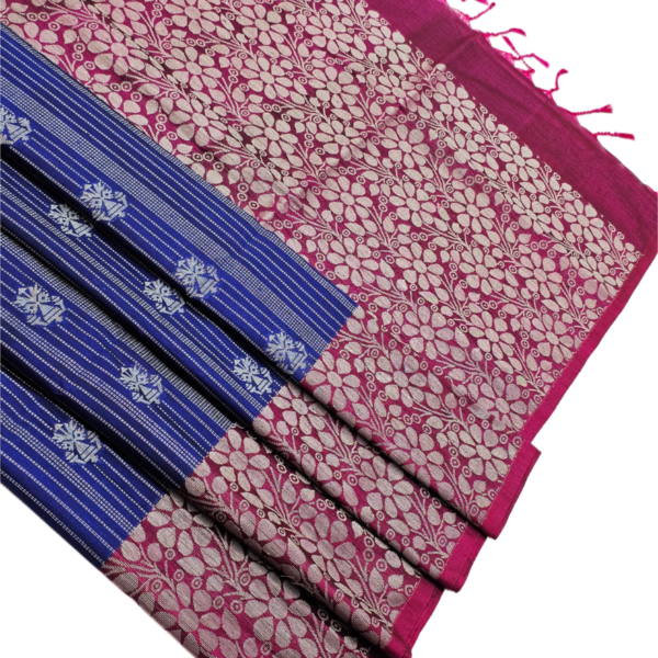 This elegant saree features a rich magenta body adorned with intricate silver floral motifs, beautifully complemented by a contrasting green pallu with traditional geometric patterns in silver. Ideal for festive occasions and celebrations, it blends classic charm with vibrant colors.