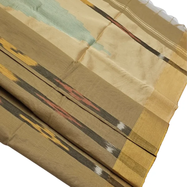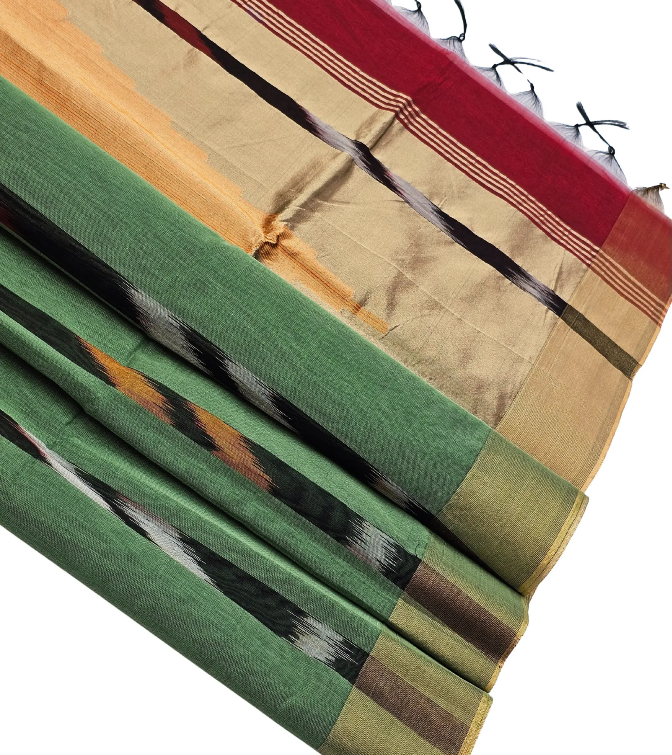 A refreshing silk cotton saree in soothing green shades with elegant handcrafted stripes.