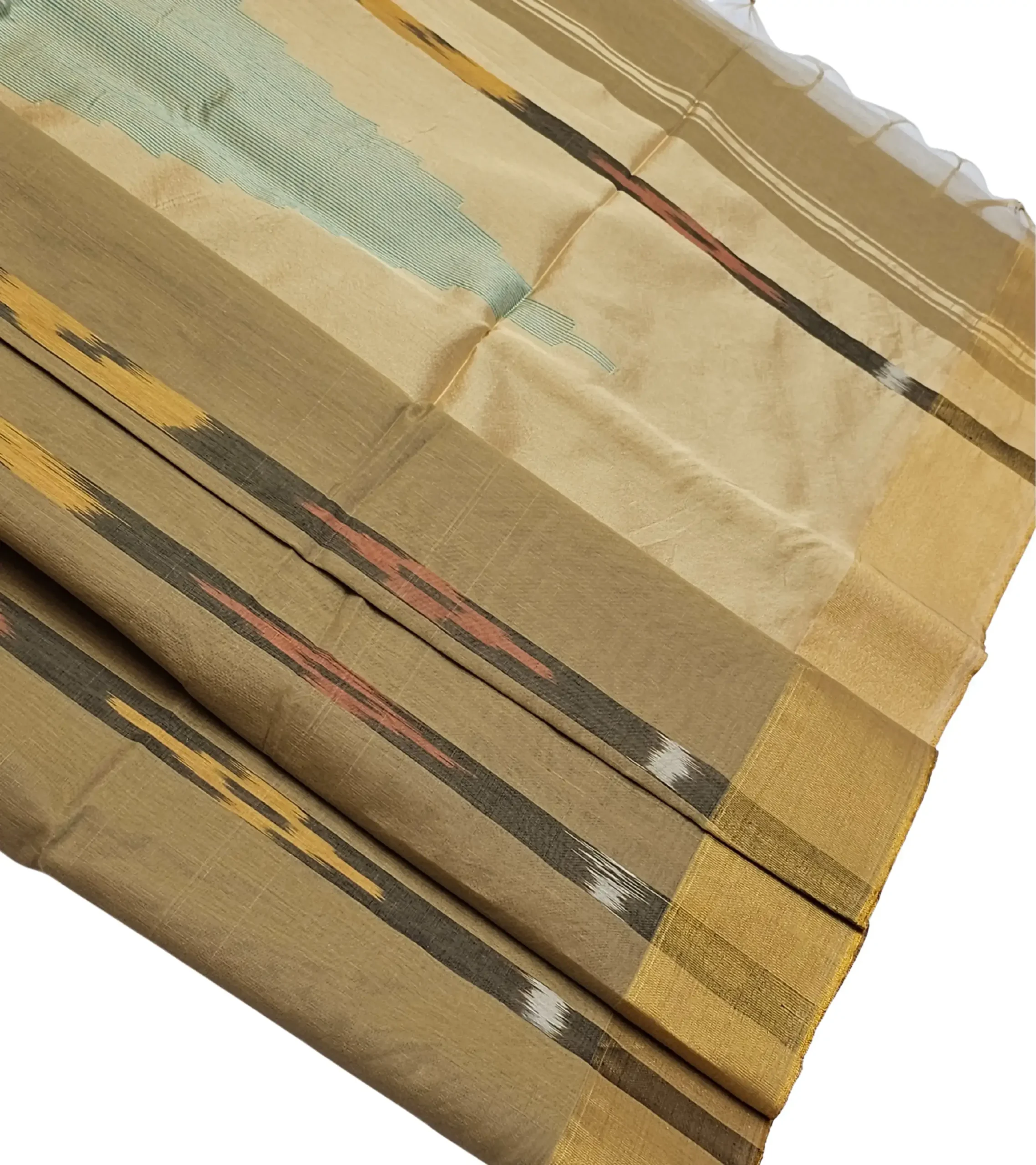 A classy silk cotton saree in earthy beige tones with subtle handcrafted stripe accents.