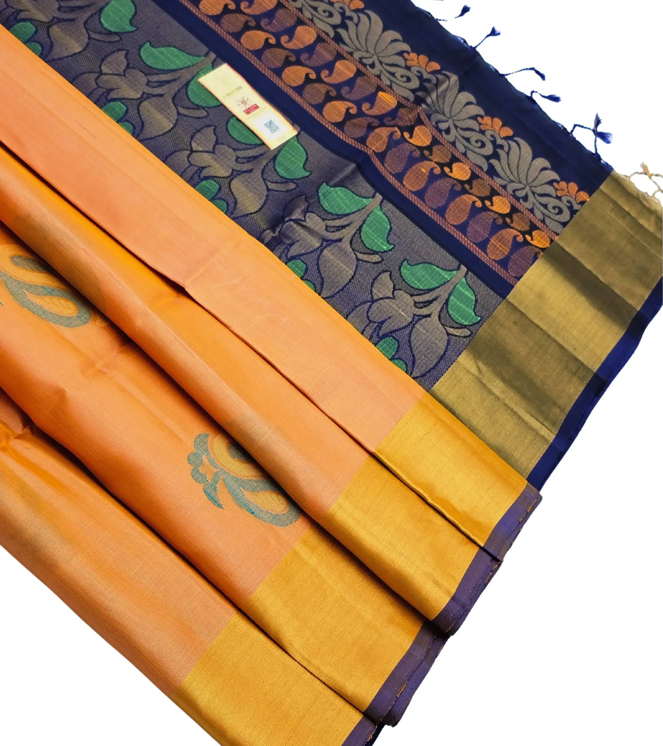 This stunning handloom silk saree blends a rich orange body with an elegant navy and gold border, creating a perfect balance of vibrance and tradition.