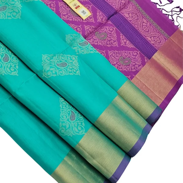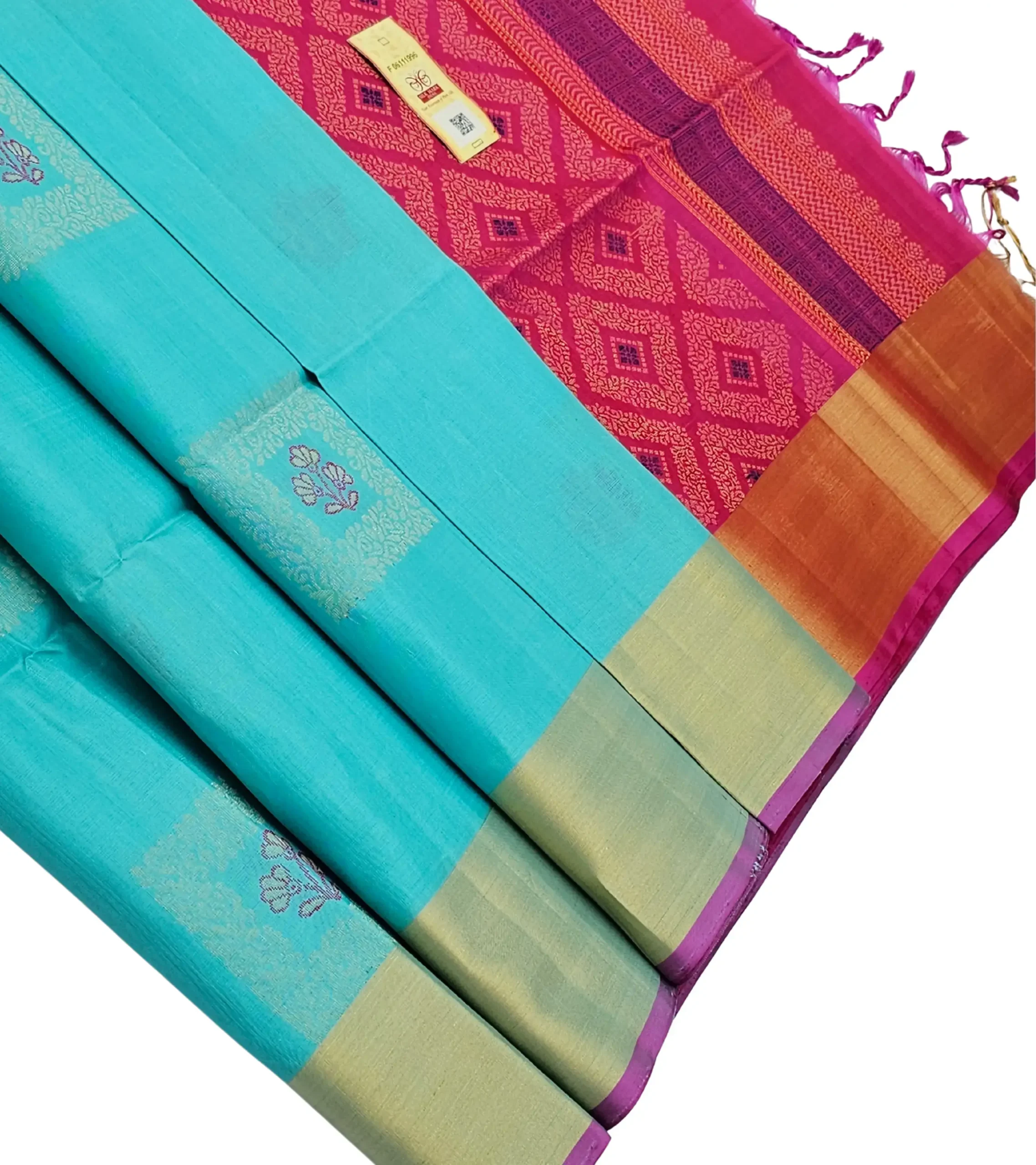 A refreshing turquoise blue body pairs beautifully with a vibrant pink pallu, creating a striking yet graceful contrast.