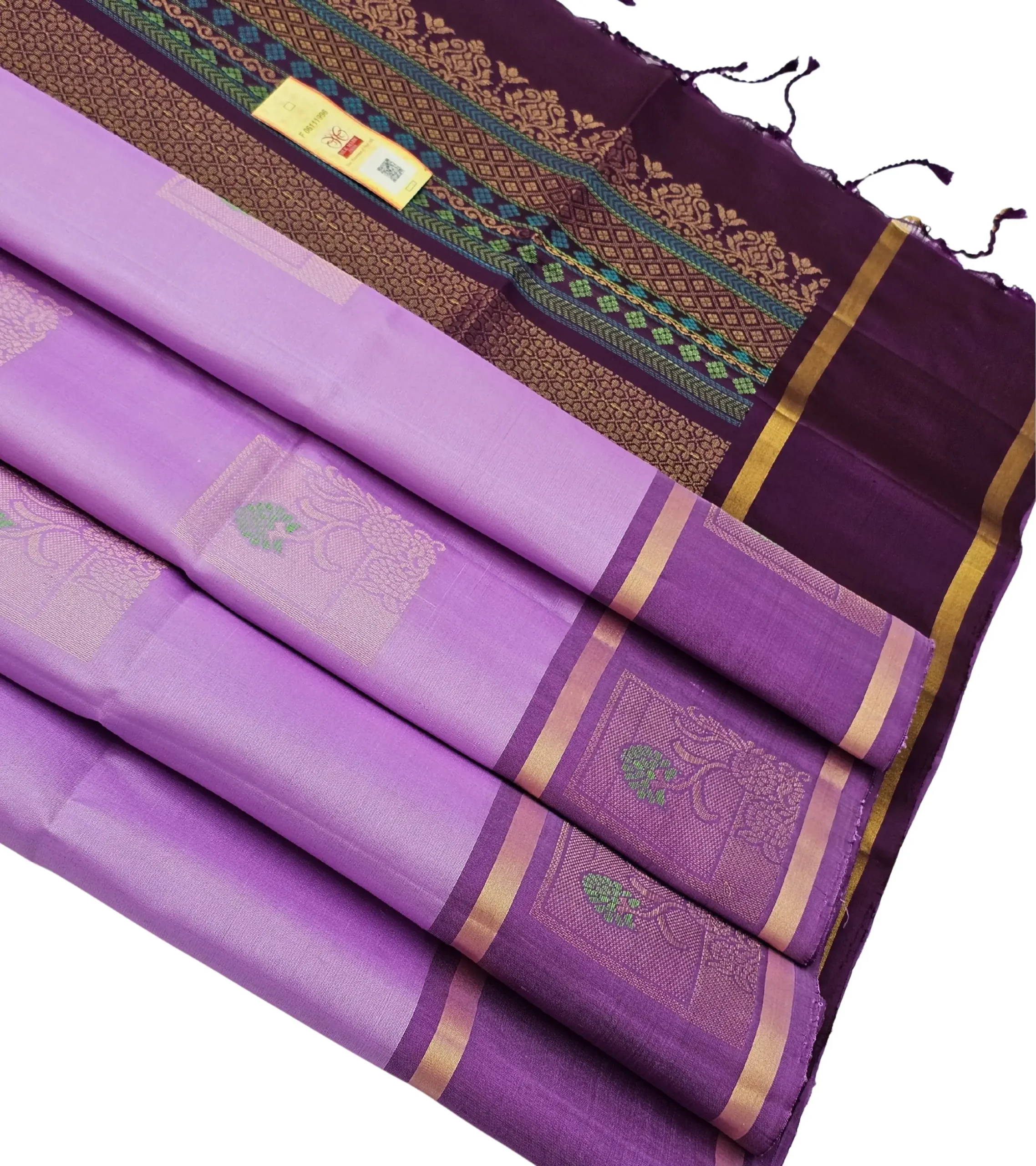 This elegant handloom silk saree features a soft lavender body paired with a rich deep-purple pallu for a regal look.