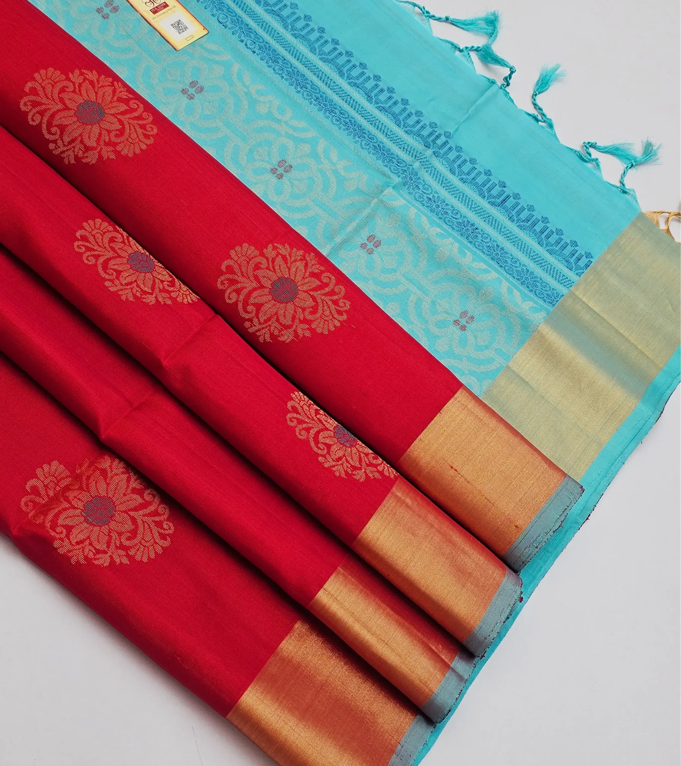 Rich red meets refreshing aqua in this Handloom soft silk saree, highlighted with elegant golden motifs and a graceful zari border.