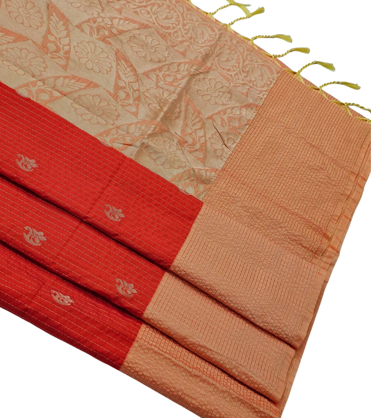 A graceful peach saree with a fiery red body creates the perfect harmony of subtlety and vibrance. 🌺 Ideal for festive and traditional moments, it radiates timeless elegance in every drape. ✨