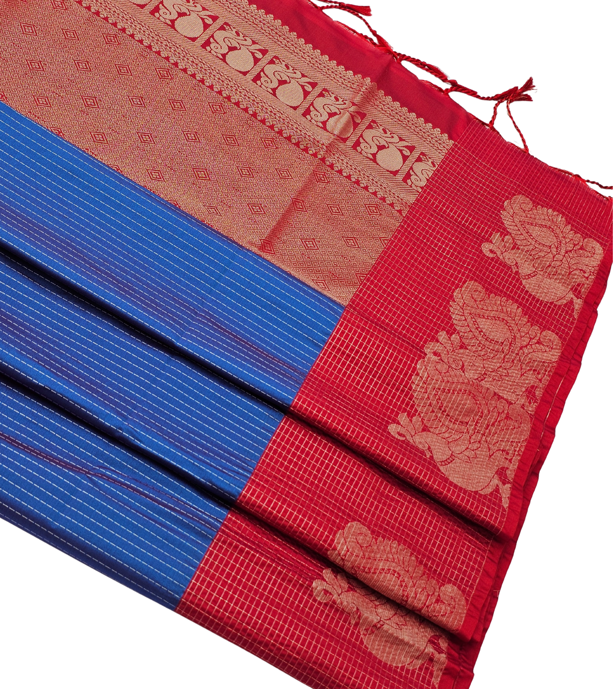 Elegant maroon stripes adorned with silver motifs meet the striking blue border for a regal appeal. 💫 A perfect blend of grace and tradition, this saree makes every moment festive-ready. 🌸