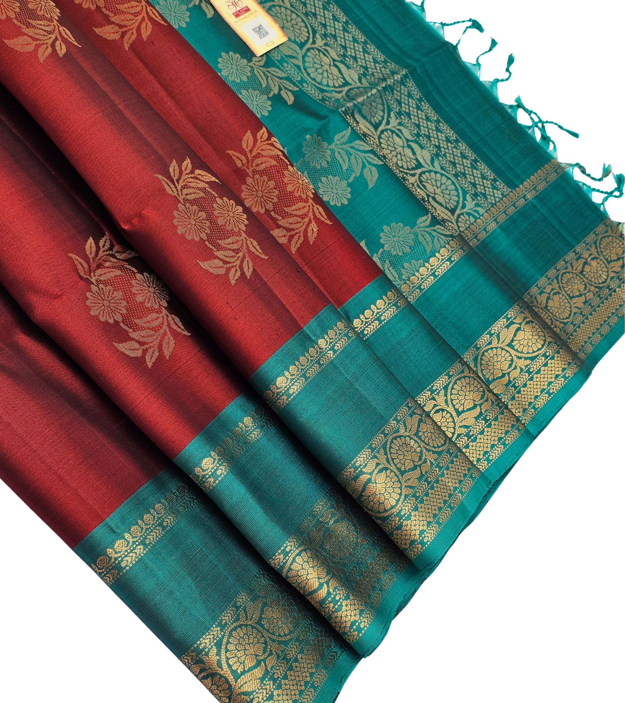 Delicate zari floral motifs shimmer gracefully across the luxurious weave.