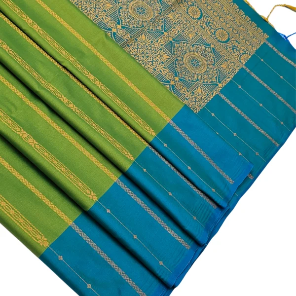 💚 A vibrant green body paired with a royal purple border creates a stunning traditional contrast.