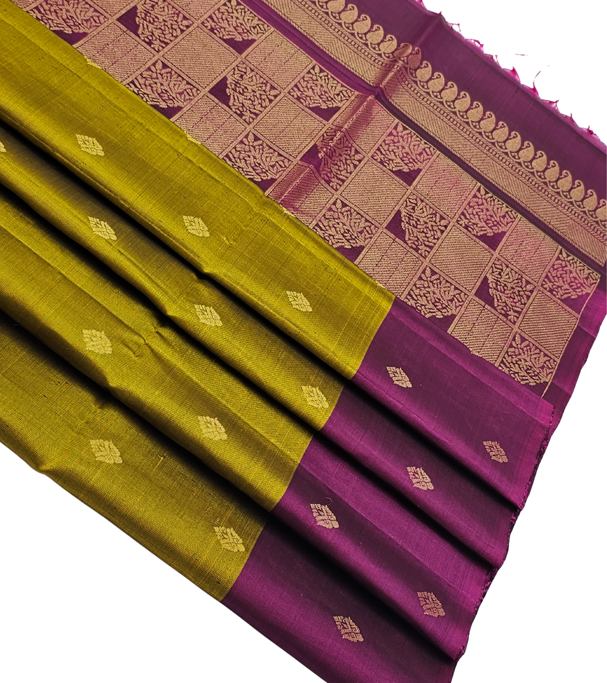 ✨ Elegant in contrast – rich olive green body with a royal magenta border, woven in golden zari magic.