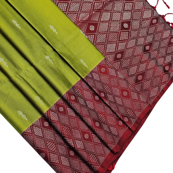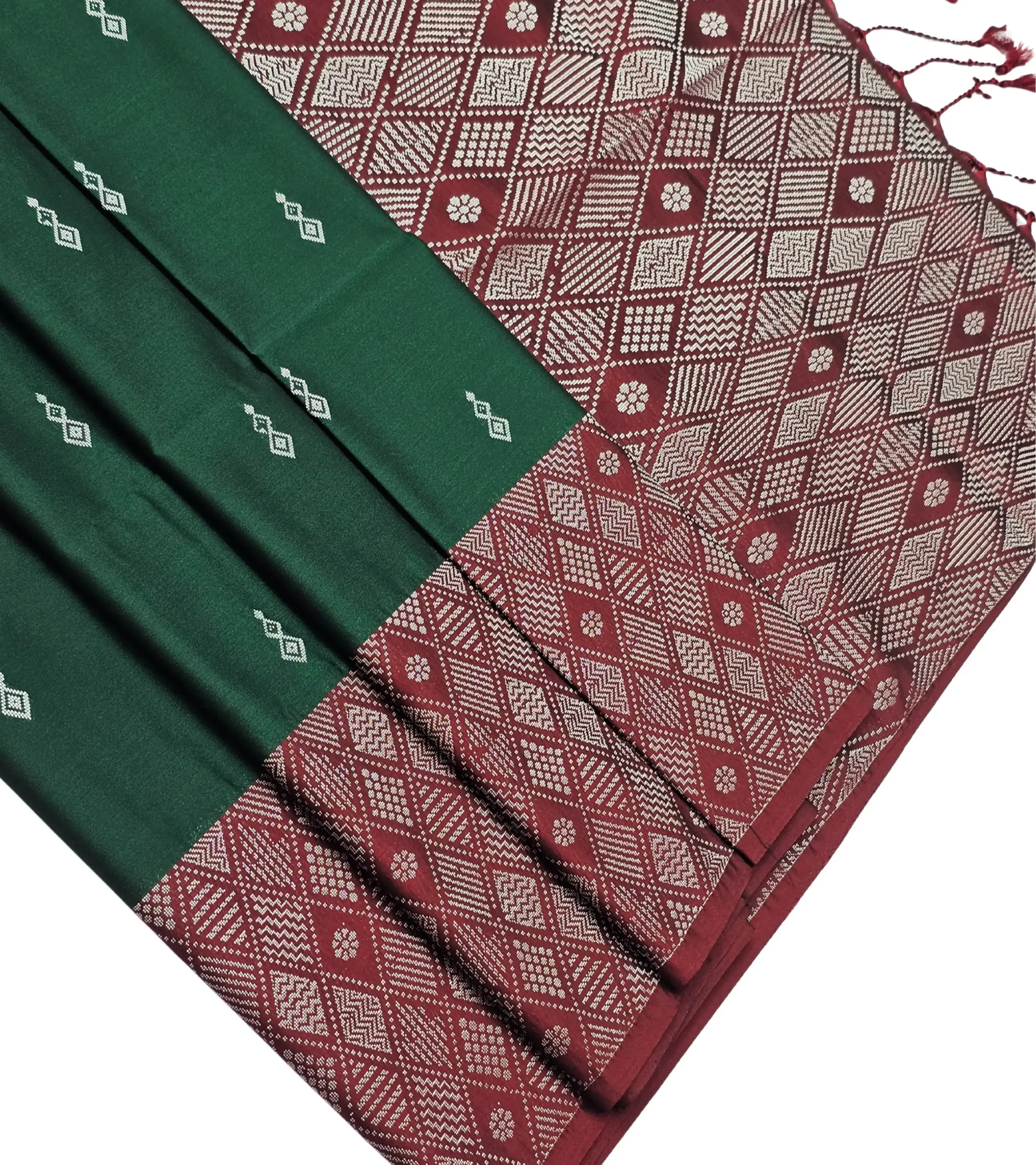 A graceful fusion of deep emerald green and classic maroon, highlighted with finely woven geometric motifs.