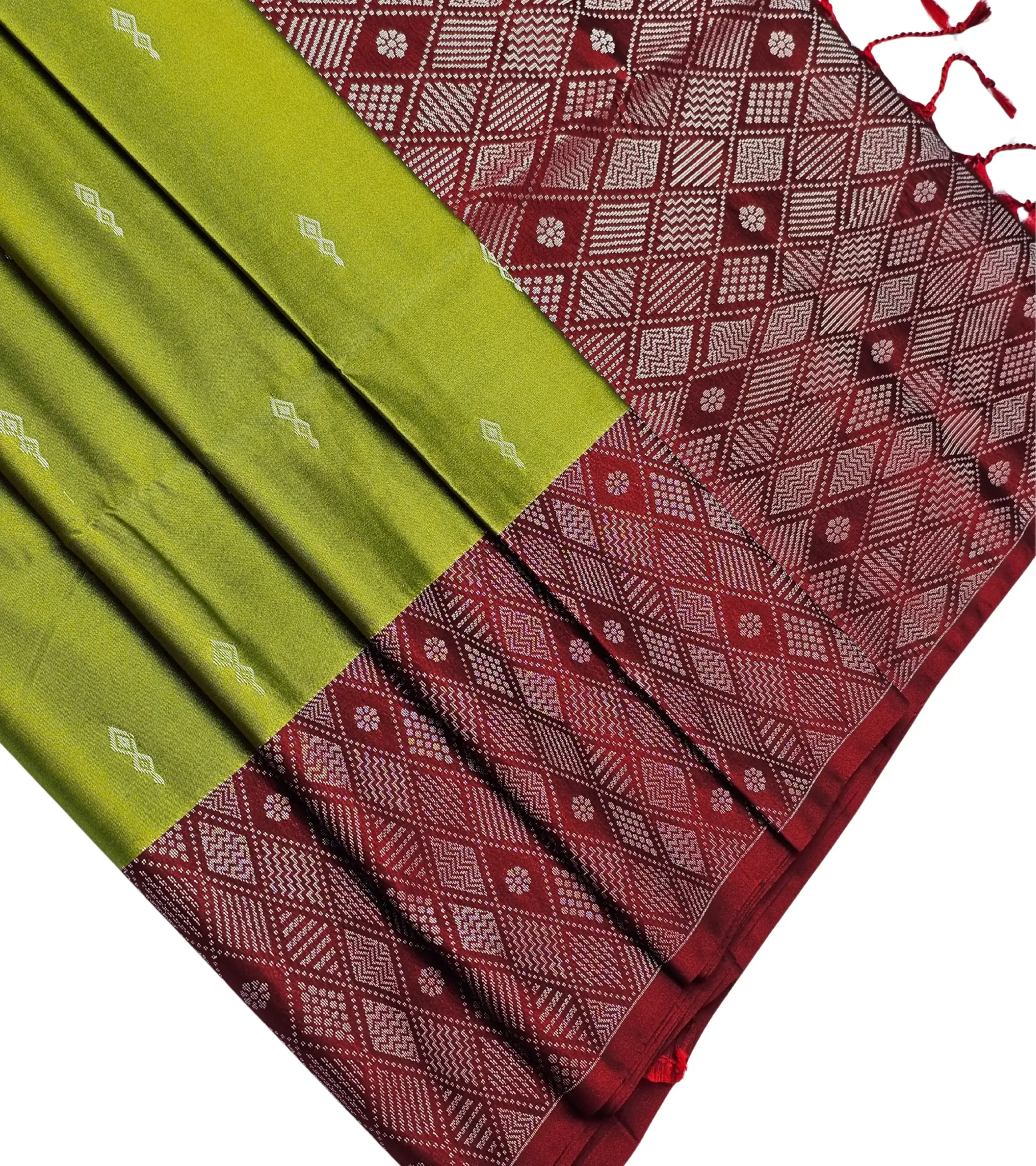 A stunning blend of refreshing olive green and rich maroon, beautifully adorned with intricate woven patterns that speak tradition.