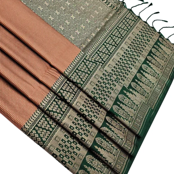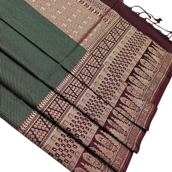 🌼 Radiate timeless charm in this mustard and maroon semi-silk saree, woven with intricate golden patterns.