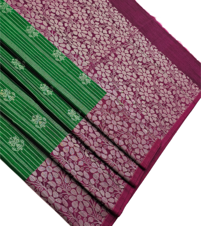 🌼 Radiate timeless charm in this mustard and maroon semi-silk saree, woven with intricate golden patterns.