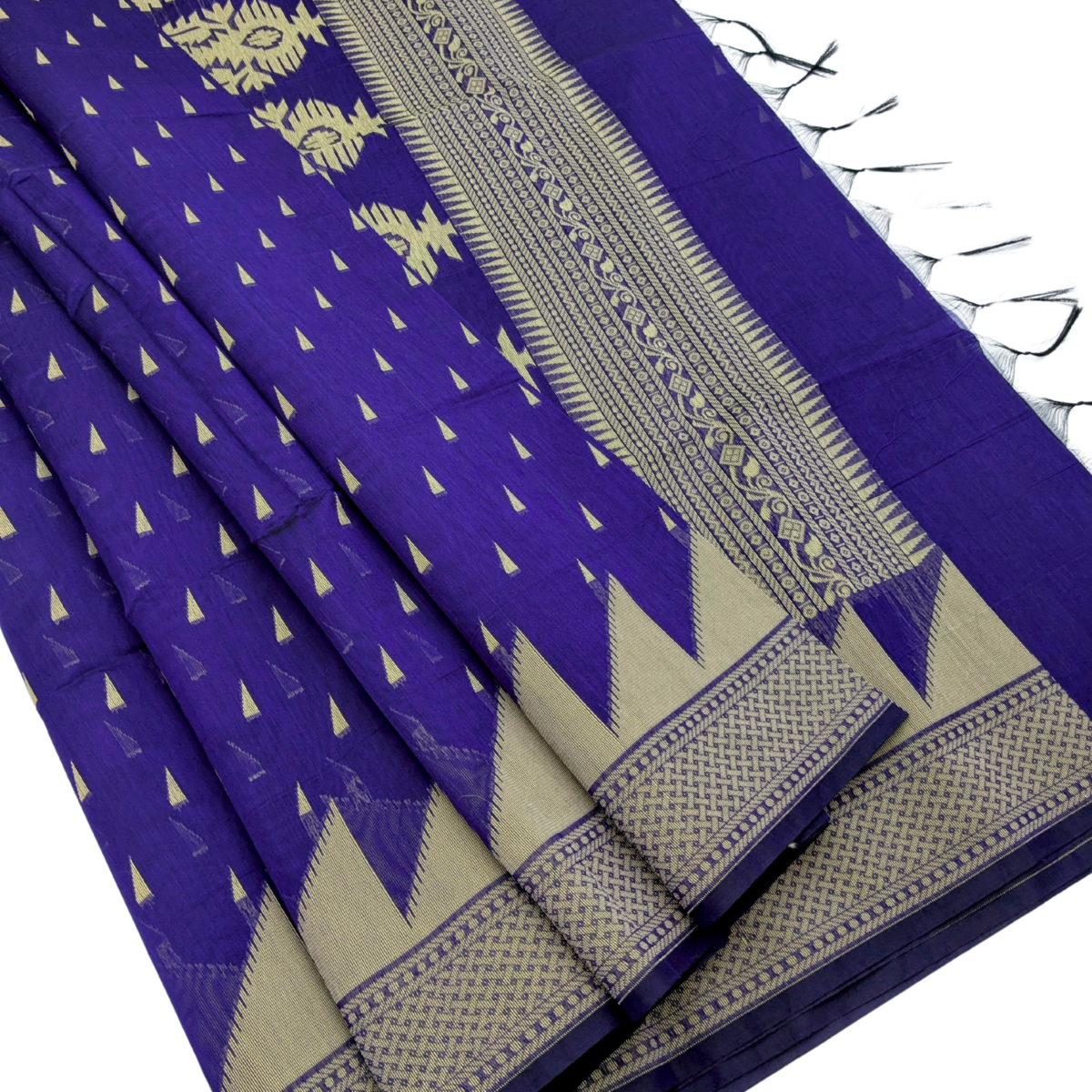 This elegant Royal Blue color semi-silk cotton saree features delicate diamond buttas throughout, creating a timeless and refined look. Paired with a plain blouse and easy-care fabric, it’s perfect for effortless everyday elegance.