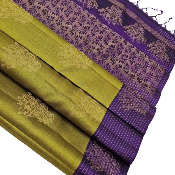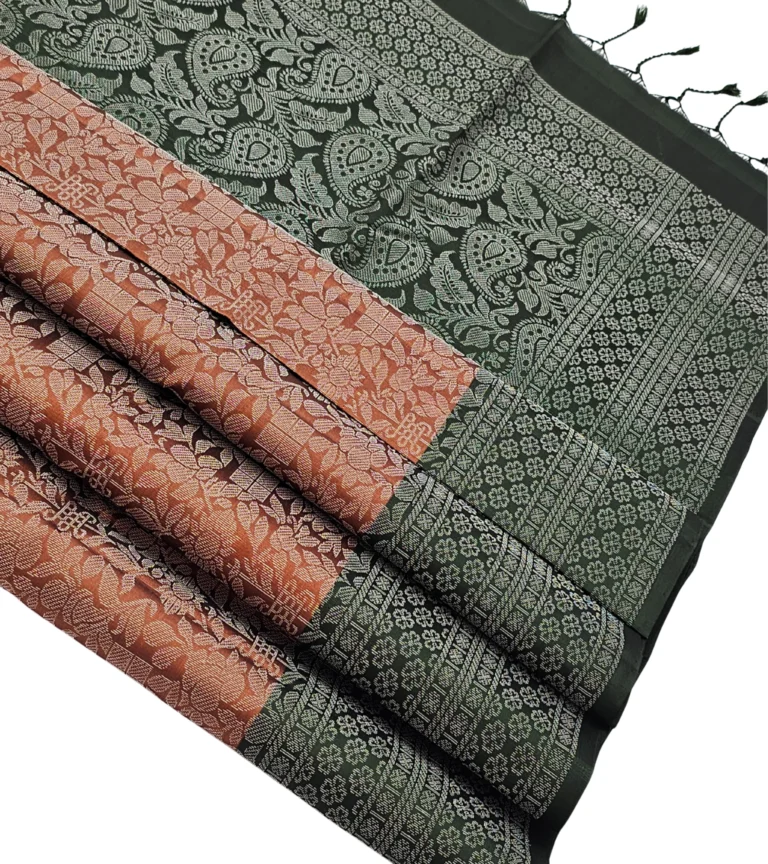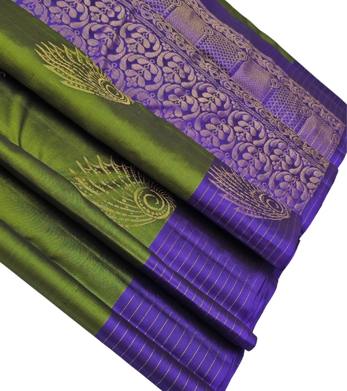 Green body with elegant floral zari buttas paired with a grand Blue golden pallu makes this saree a timeless beauty. ✨ Perfect blend of grace and tradition for every special occasion. 🌸