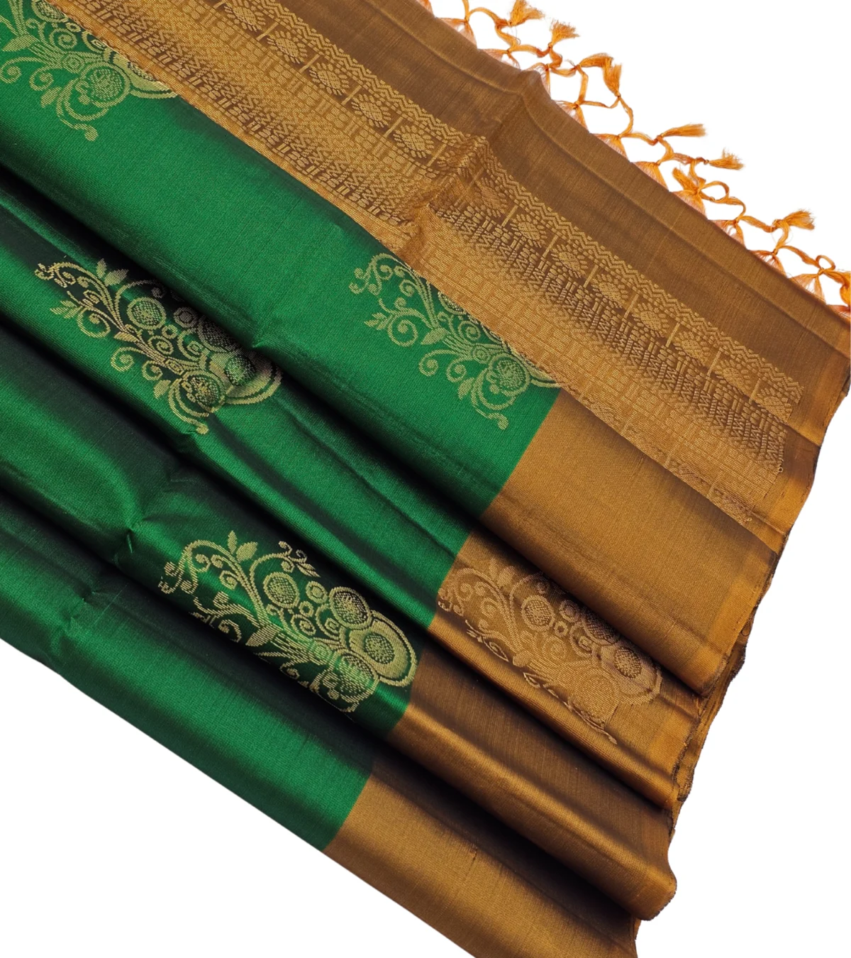 Graceful in emerald green with a touch of gold, this saree radiates festive charm and elegance. A perfect blend of tradition and richness, it’s made to shine at every celebration. 🌿✨