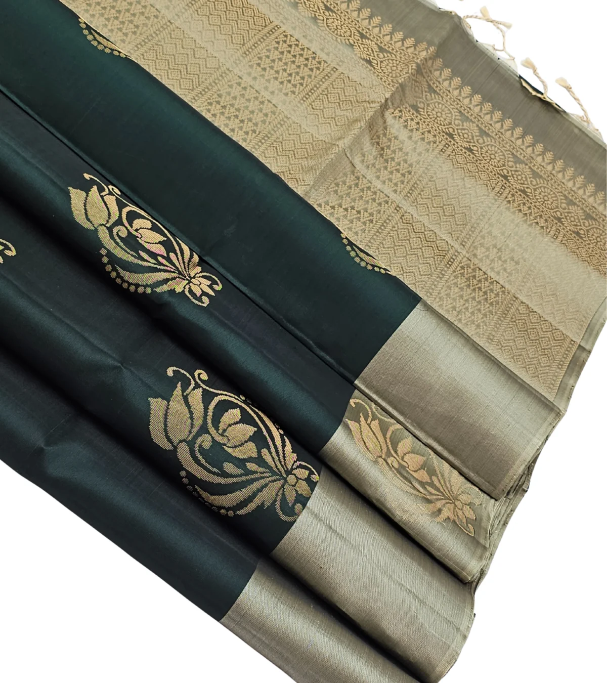 Elegant in deep green with a silver-golden glow, this saree speaks of pure sophistication. Perfect for grand occasions, it adds a royal charm to your timeless beauty. ✨🌸