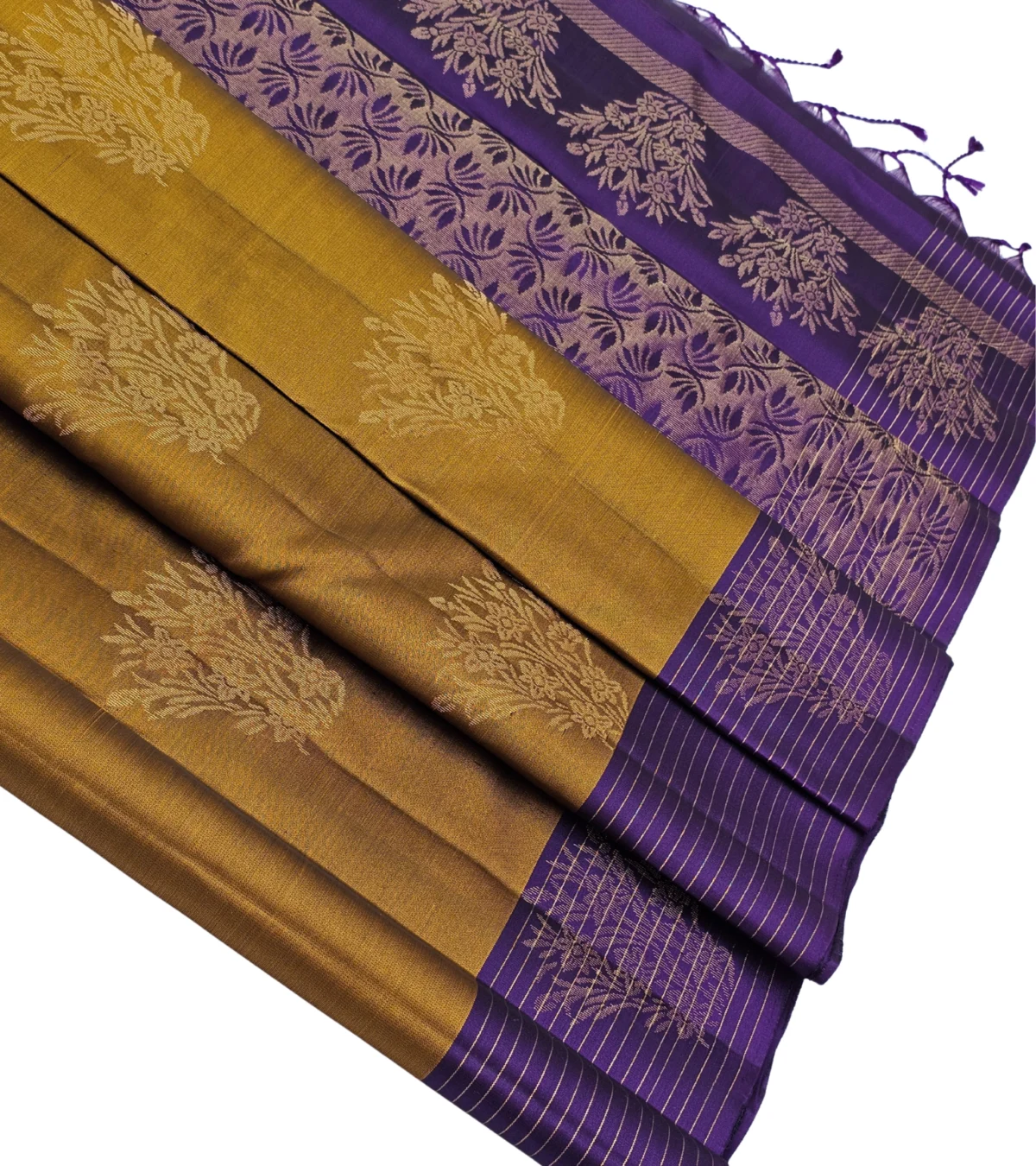 A stunning blend of Musted Yellow body with floral zari buttas, highlighted by a rich Violet pallu in golden weave. πΈβ¨ A saree that radiates festive charm and timeless elegance. π